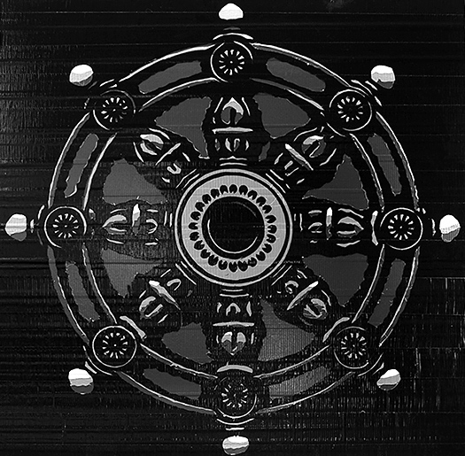 The Wheel of Law or Wheel of Dharma. The eight spokes of the wheel represent the Noble Eightfold Path. Their equal length symbolizes justice. The tire around the wheel represents the all-embracing Wisdom of Buddhahood. The hub teaches us modesty and thoughtfulness. The axle is the unchanging Truth upon which the Wheel turns.